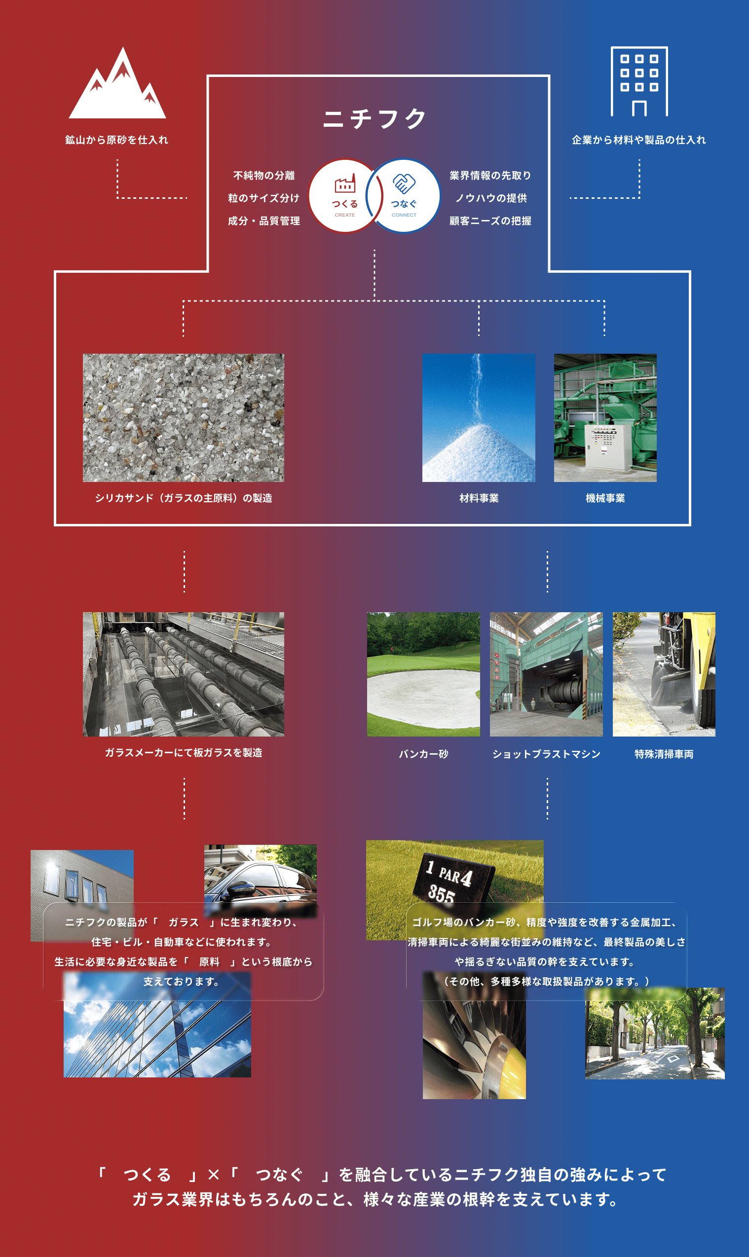 | 会社沿革 | ・1933年 窯業原料輸入販売を目的として、株式会社福酉商会を設立 ・1946年 ガラス原料製造を目的として、日豊珪砂工業株式会社を設立 ・1997年 中国福建省に日本板硝子株式会社との共同出資で福建日翔非金属砿有限公司を設立。 ガラス珪砂の生産と日本への輸出を開始(2007年撤退) ・1998年 日豊珪砂工業株式会社と株式会社福西商会が合併。株式会社ニチフクに社名変更 |